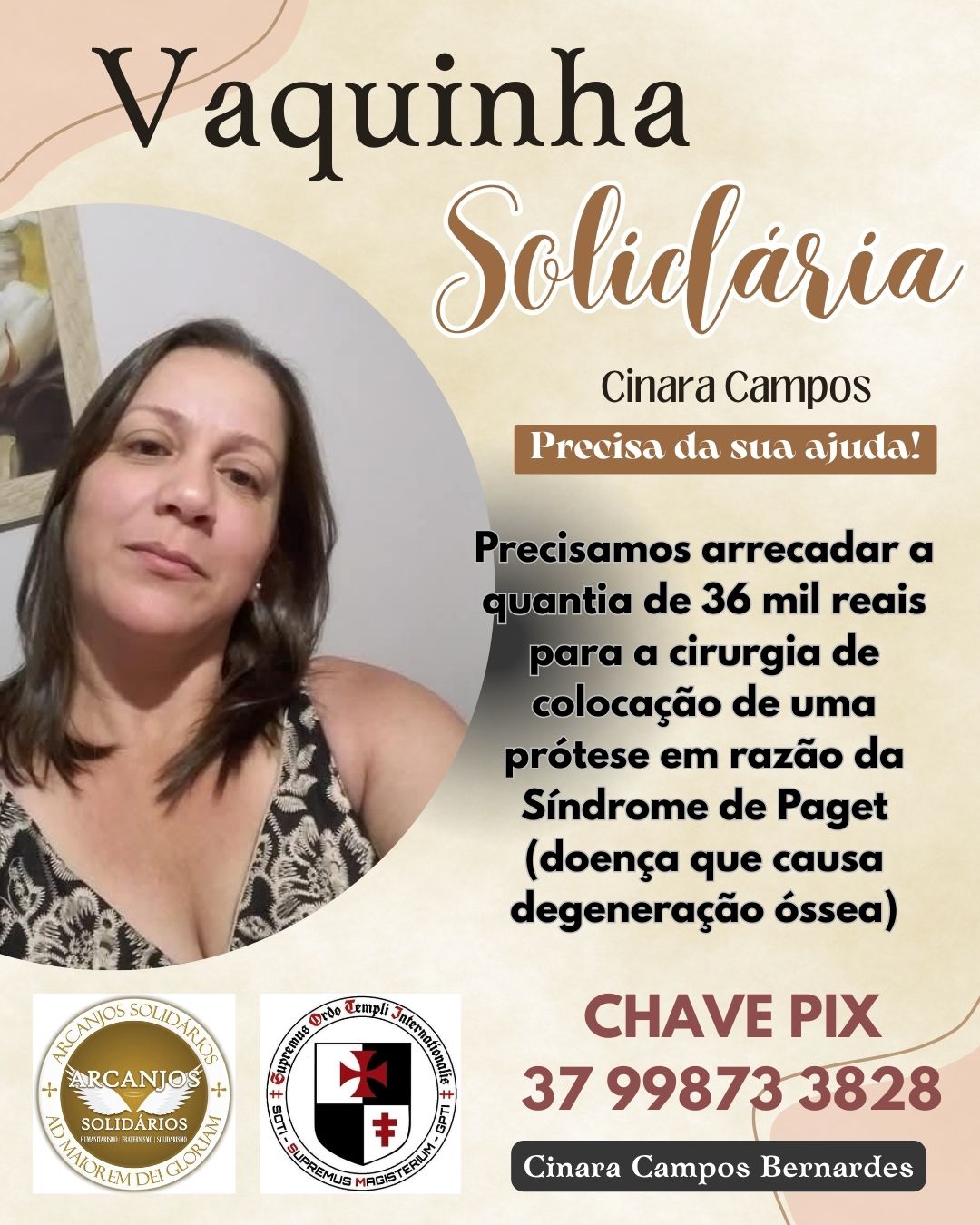 A Associação SOTI de Bambuí juntamente com o Grupo Arcanjos Solidários, está promovendo a campanha de divulgação da Vaquinha de arrecadação para a bambuiense Cinara Campos Bernardes, diagnosticada com Síndrome de Paget, doença rara que provoca degeneração dos ossos. O quadro clínico causou necrose no quadril e no fêmur, comprometendo gravemente sua mobilidade e qualidade de vida.