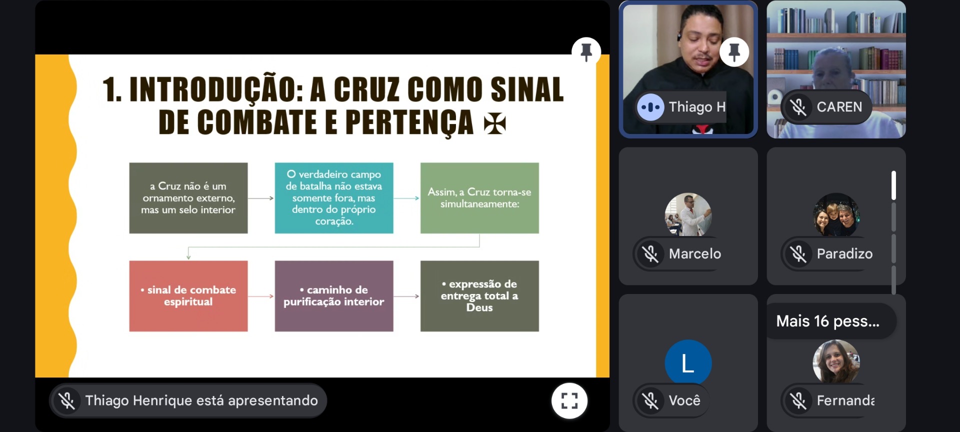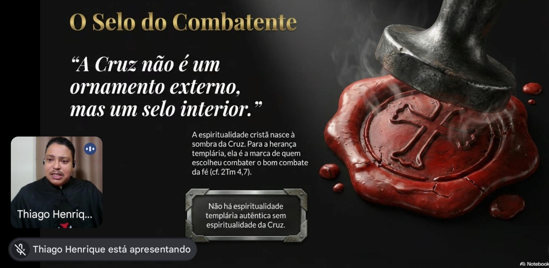 Em sua exposição, o formador explicou que a cruz é também expressão máxima da entrega de Deus pela humanidade, revelada no sacrifício de Cristo. Nesse sentido, viver a espiritualidade da cruz significa assumir um caminho de fidelidade, entrega e amor, inspirado no exemplo de Jesus. Outro ponto importante abordado foi que não existe espiritualidade templária autêntica sem a espiritualidade da cruz. Segundo o frade Crúzio Thiago, a tradição espiritual da cavalaria cristã nasce da união entre fé, disciplina e vida interior, tendo a cruz como centro do chamado e da missão daqueles que desejam viver esse carisma.