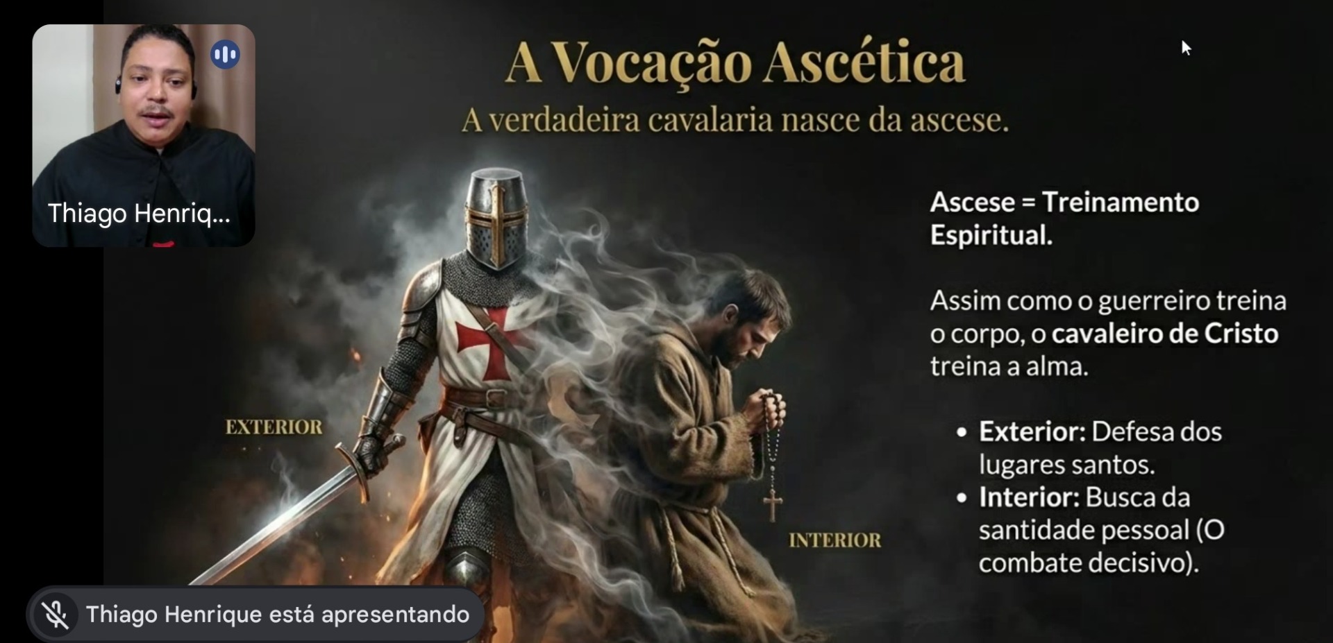 A formação também tratou do chamado de Cristo ao combate espiritual, compreendido como uma luta interior contra as próprias fraquezas, contra o pecado e contra tudo aquilo que afasta o ser humano de Deus. Nesse contexto, destacou-se a importância da vocação ascética, entendida como um caminho de disciplina espiritual, oração, vigilância e constante busca pela santidade. De acordo com o frade, a verdadeira cavalaria nasce da ascese, ou seja, de uma vida espiritual bem estruturada e alimentada por práticas constantes de oração, penitência e formação interior. Assim como um cavaleiro se prepara para a batalha, o cristão é chamado a viver um permanente treinamento espiritual, fortalecendo sua fé e sua fidelidade a Deus.